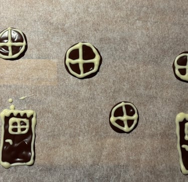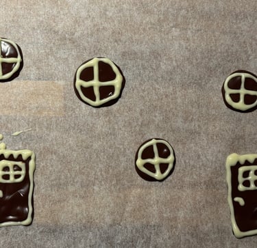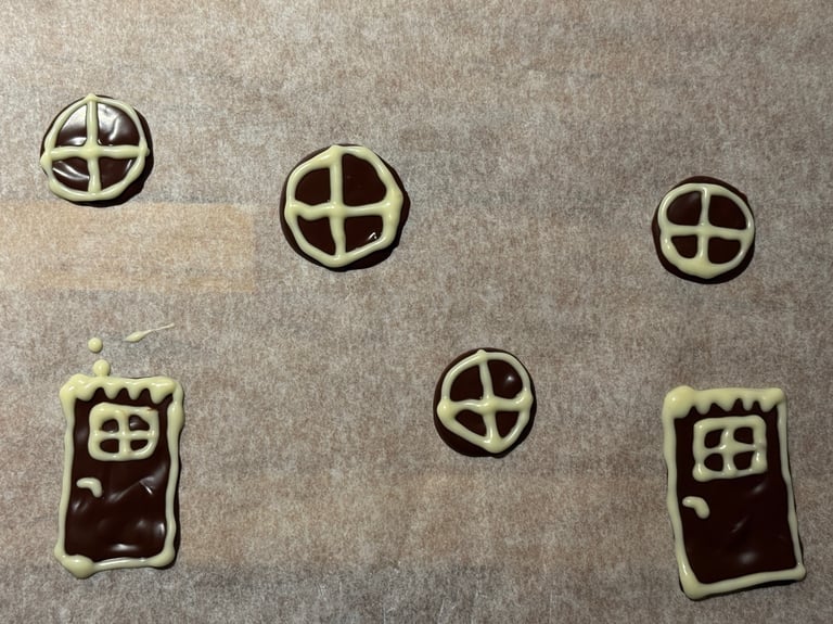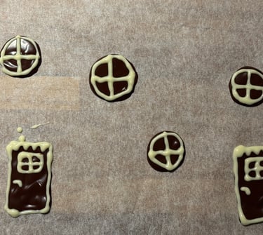 Avec le reste de chocolat réaliser les décors (portes et fenêtres). Décorer avec un peu de chocolat blanc fondu, disposé dans un poche à douille ou un cornet.