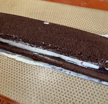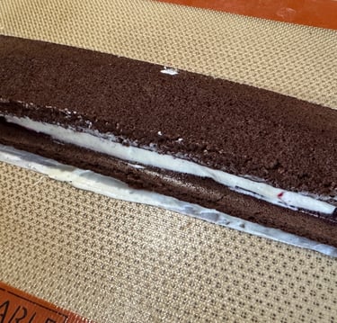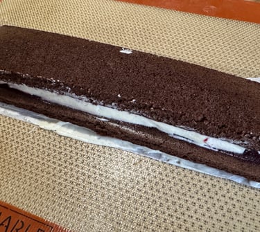 Quand la bûche est prise, la démouler. Couper en triangle la partie composée de deux épaisseurs de génoise pour former le toit du chalet.