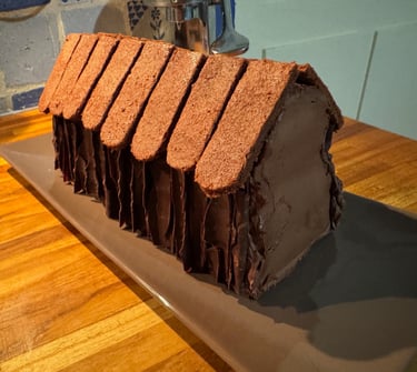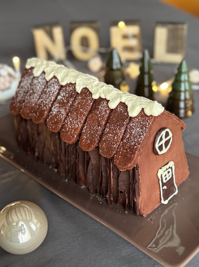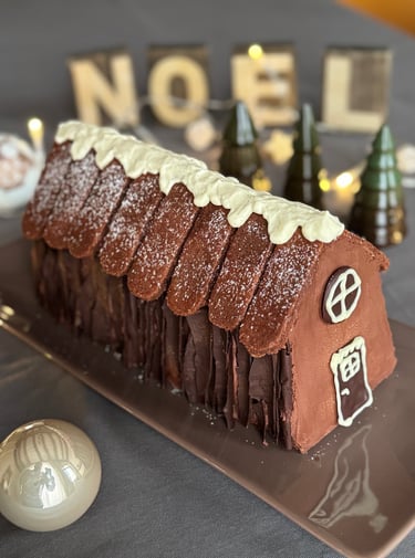 Noël est en approche ! Cette bûche façon chalet ne présente pas de difficulté particulière à réaliser, mais vous demandera un peu de temps pour la décoration ! Tout est préparable à l'avance, et donc parfaitement intégrable dans une journée chargée de réveillon, avec un résultat qui émerveillera vos convives !