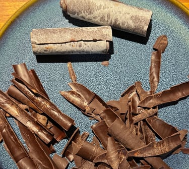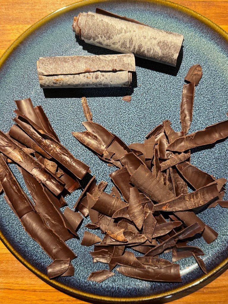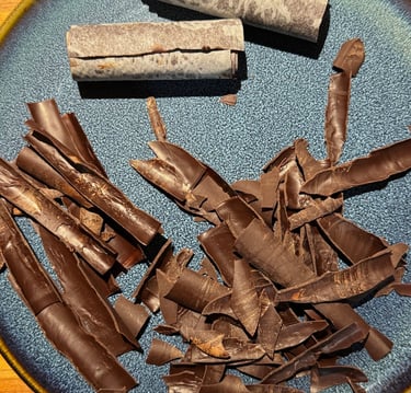 Préparer 4 bandes de papier cuisson de la hauteur du moule à cake. Etaler du chocolat noir sur chaque bande en couche fine, et dès que le chocolat commence à cristalliser, rouler la bande de papier cuisson sur elle-même. Réserver jusqu'à ce que le chocolat ait bien pris. En déroulant doucement les bandes, vous obtiendrez des copeaux pour décorer le pourtour du chalet.