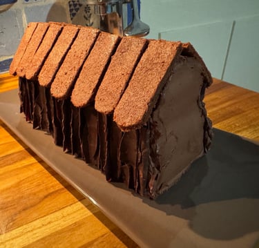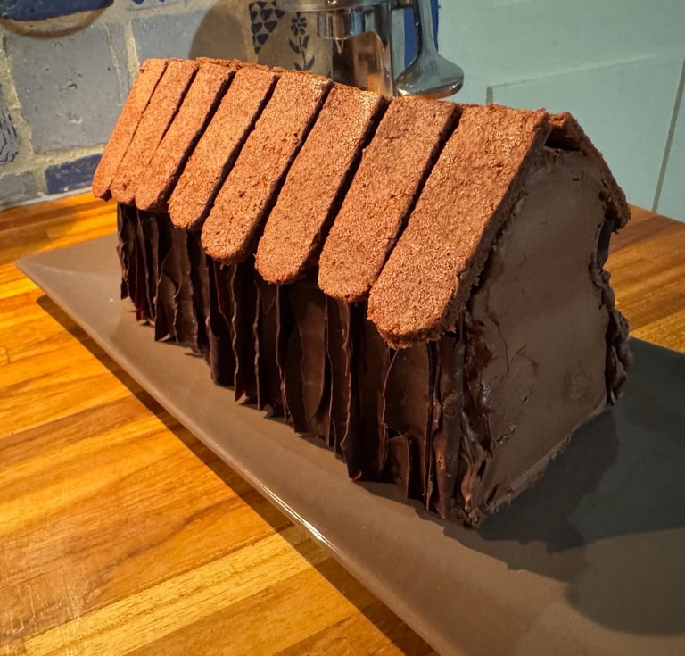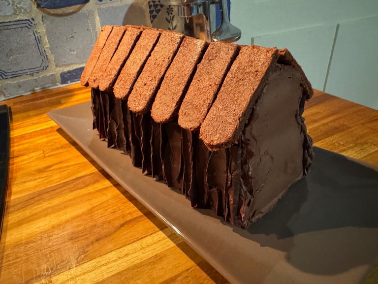 Réchauffer la ganache au chocolat noir qui doit avoir une consistance de pâte à tartiner souple. Utiliser un peu de ganache au chocolat pour coller le toit sur le chalet. Couvrir le toit du chalet d'une couche de ganache au chocolat, y coller les tuiles en biscuit.