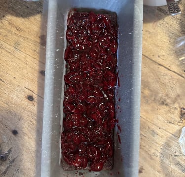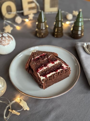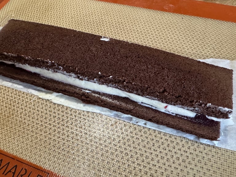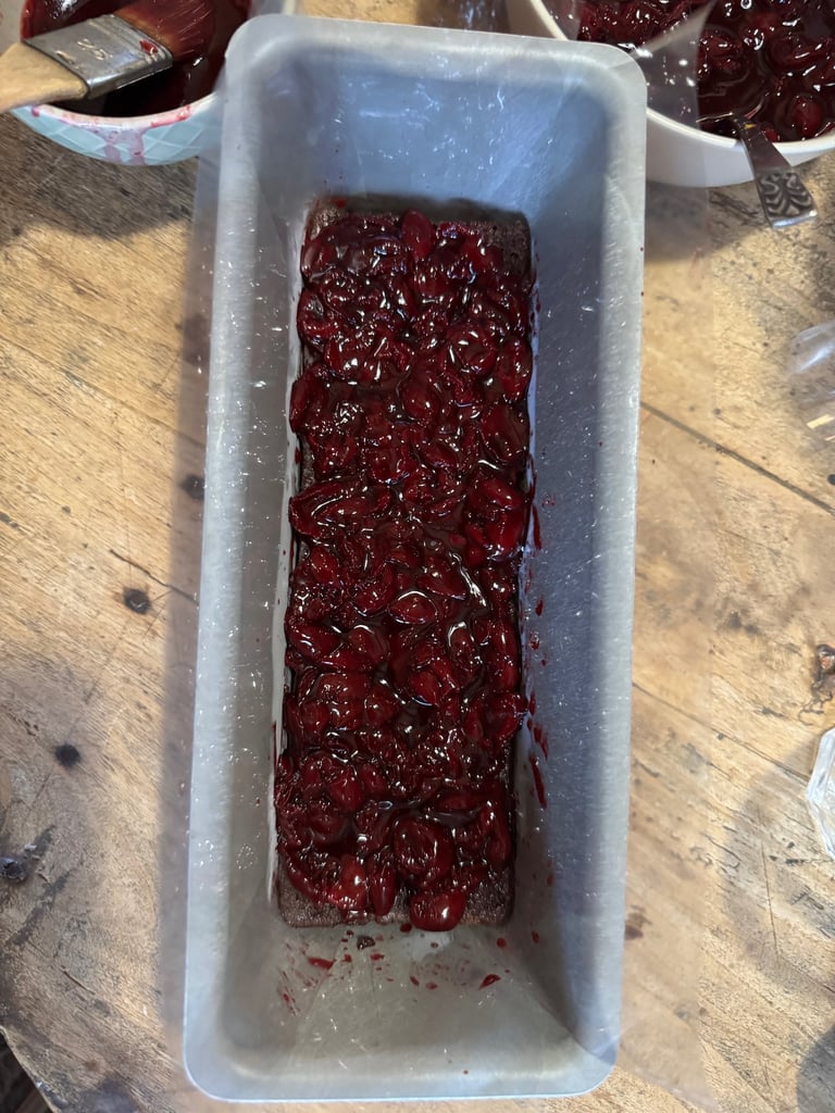 Sur une plaque (ou un autre moule à cake de même taille que le précédent), disposer une couche de génoise, imbiber de sirop, ajouter de la compotée de cerises, une couche de ganache montée et couvrir de la dernière tranche de génoise.