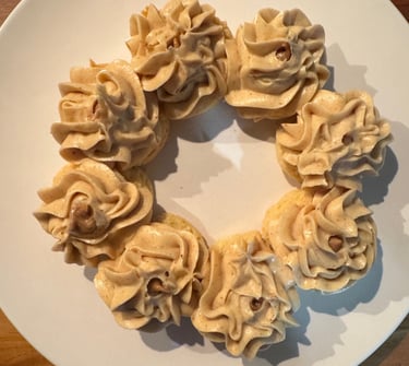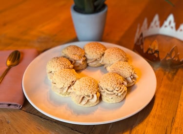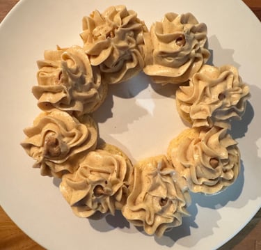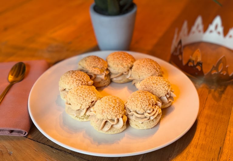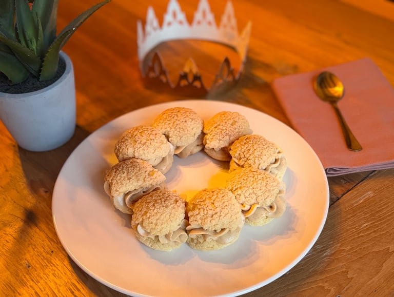 Cette année, on fête les rois non pas avec une traditionnelle galette mais avec une couronne de choux généreux, garnis de frangipane, d'une délicieuse crème aux amandes et d'un praliné amande fondant. Alors, qui aura la fève ?