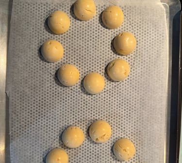 Sur une plaque de papier cuisson, dessiner 2 cercles de 16 cm de diamètre. Retourner la feuille sur une plaque percée. Disposer à l'intérieur de chaque cercle 8 demi sphères de pâte à choux congelée.
