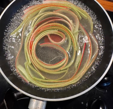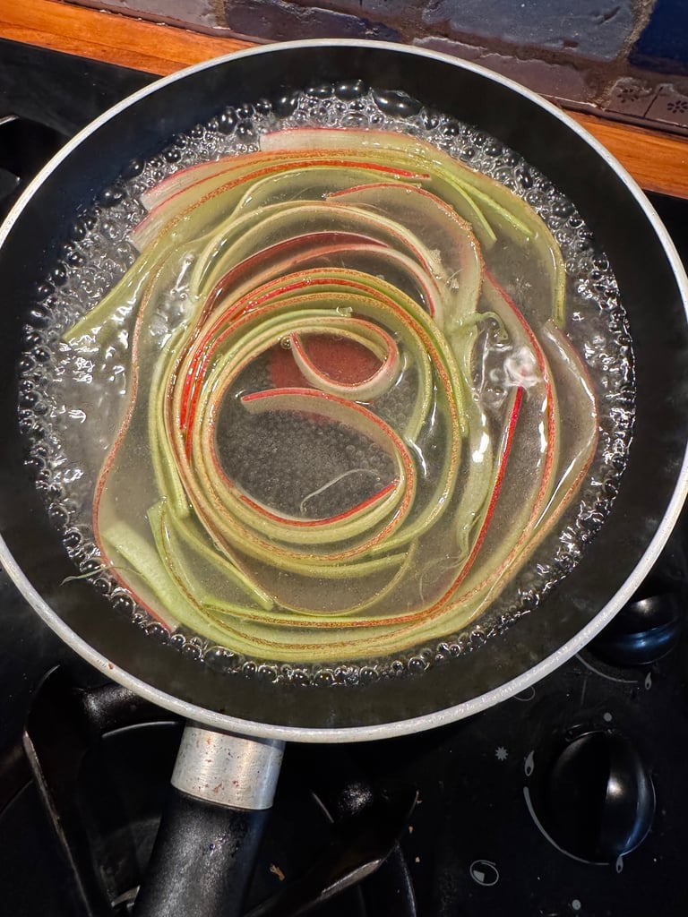 Découper à la mandoline des bandes de rhubarbe (non épluchées pour conserver la couleur et l'effet bandes) d'environ 2 mm d'épaisseur. Les faire cuire quelques minutes dans une poêle avec un mélange d'eau et de sucre (environ 150 ml d'eau et 50 g de sucre) jusqu'à ce qu'elles soient devenues tendre.