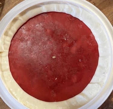 Démouler l'entremet, disposer le cercle de bandes de rhubarbe au centre, couvrir de nappage transparent. Laisser décongeler au moins 5h au réfrigérateur ou 2h à température ambiante avant dégustation.