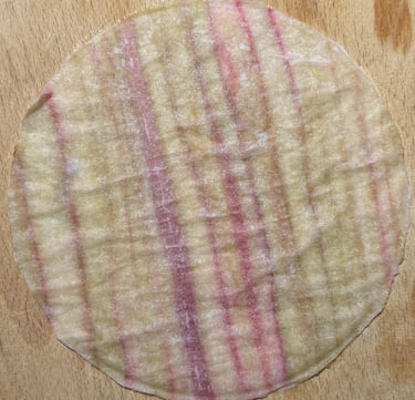 Quand les tranches de rhubarbe sont bien congelées, découper avec un couteau parfaitement aiguisé (couteau en céramique) un cercle de 14 cm de diamètre et réserver au congélateur.