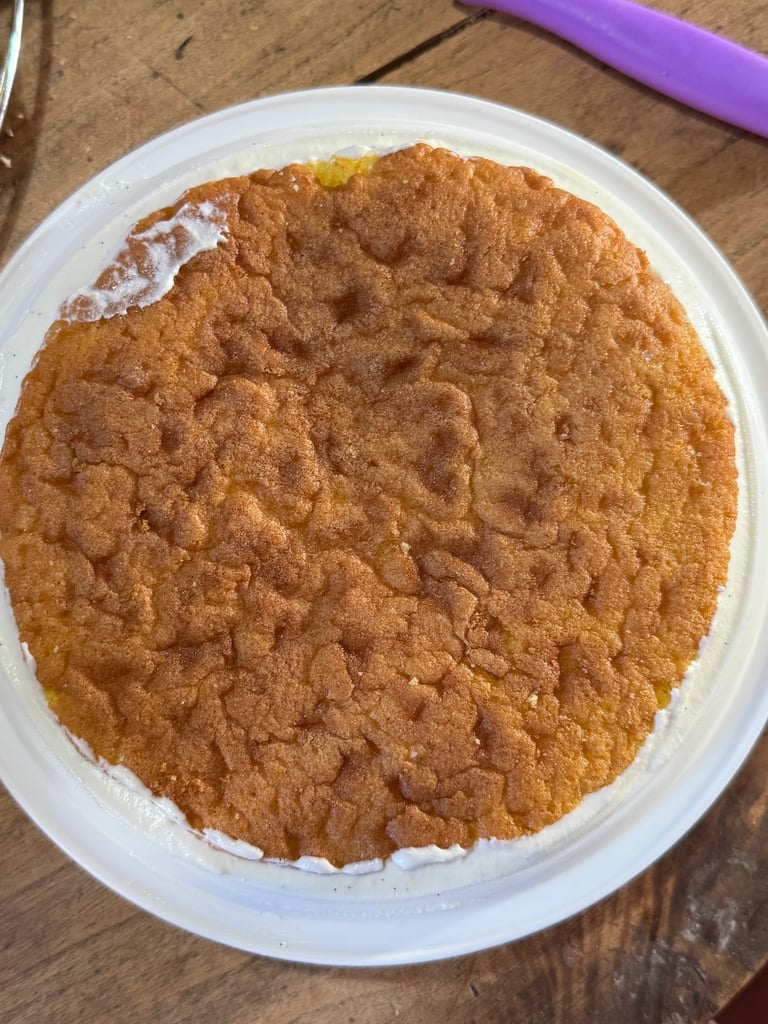 Démouler, laisser refroidir puis le trancher en 2 (une des deux moitié pourra servir pour une prochaine recette) et, à l'aide d'un gabarit, découper un cercle de 18 cm de diamètre dans ce gâteau.