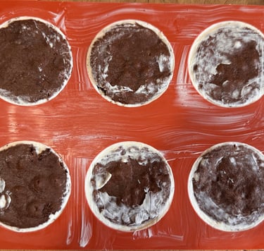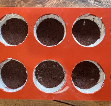 Découper 12 cercles de biscuit au chocolat à l'aide d'un emporte pièce de la taille des moules. Imbiber au pinceau les cercles de biscuit avec le sirop d'imbibage.