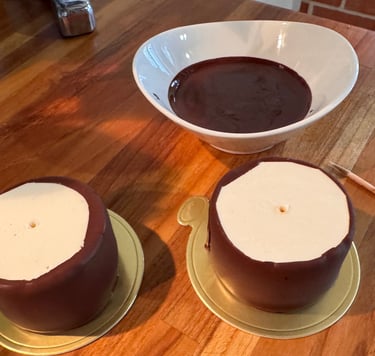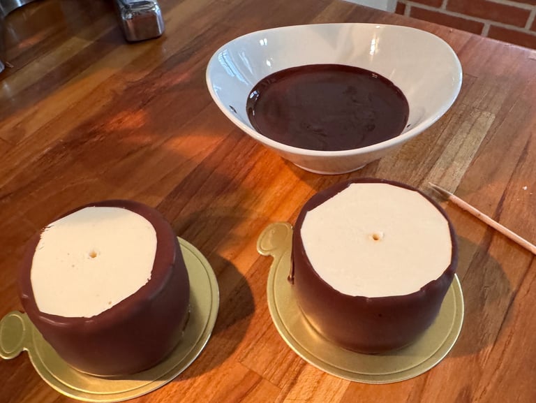 Démouler les entremets congelés, piquer le centre avec un pic à brochette, et enrober de chocolat le pourtour des entremets. Au contact du gâteau encore congelé, le chocolat va figer instantanément.