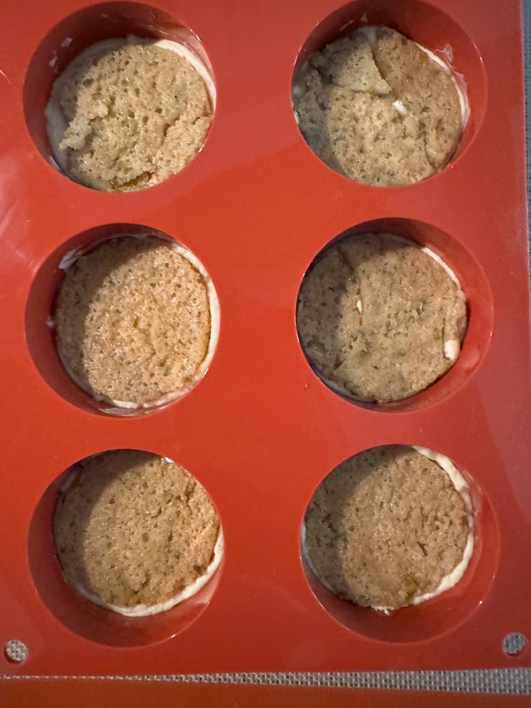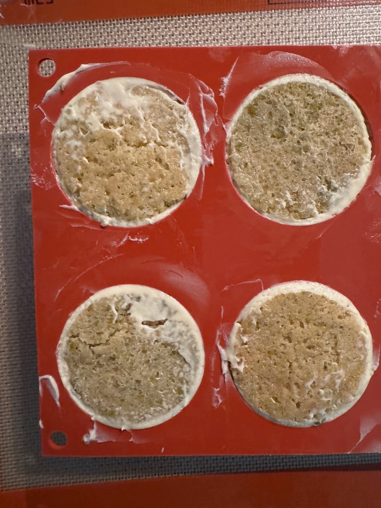 Laisser refroidir puis détailler 6 cercles de 6 cm de diamètre et 6 cercles de 5 cm de diamètre à l'aide d'emporte-pièces. Réserver au congélateur les cercles de biscuit.