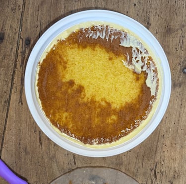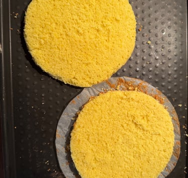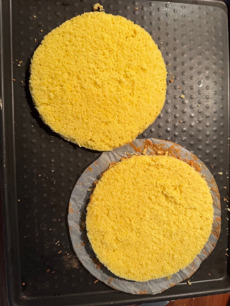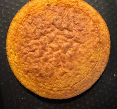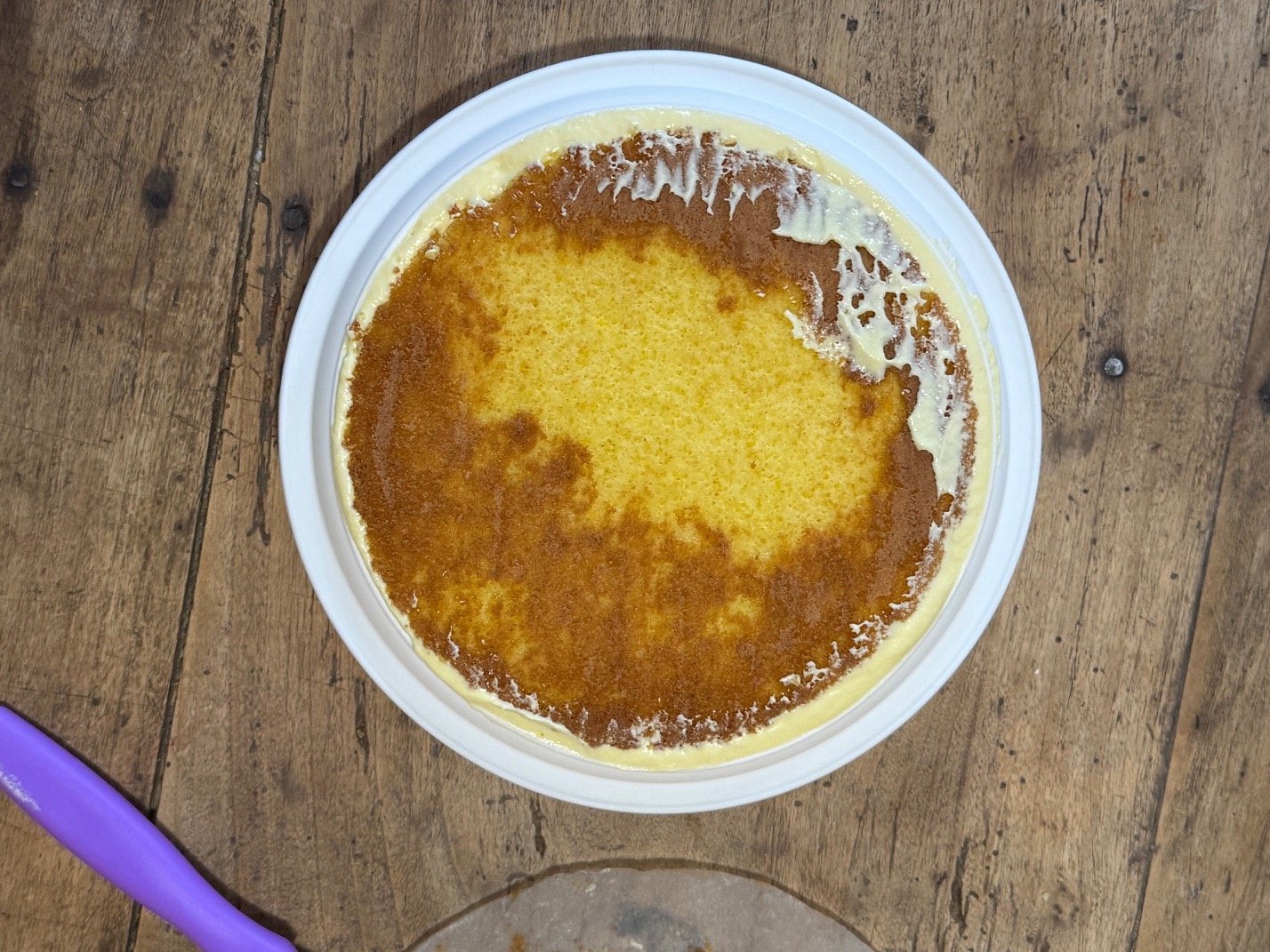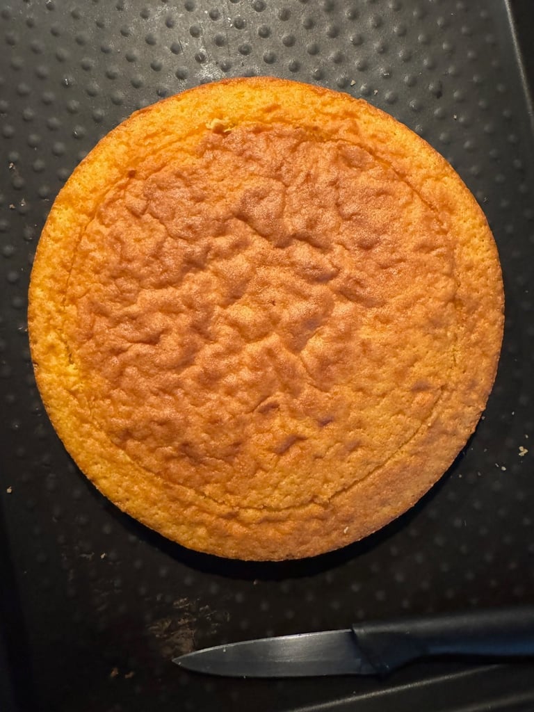 Démouler, laisser refroidir puis le trancher en 2 (une des deux moitié pourra servir pour une prochaine recette) et, à l'aide d'un gabarit, découper un cercle de 18 cm de diamètre dans ce gâteau.