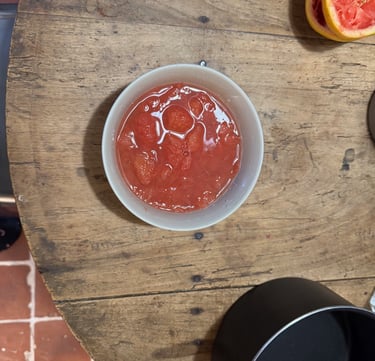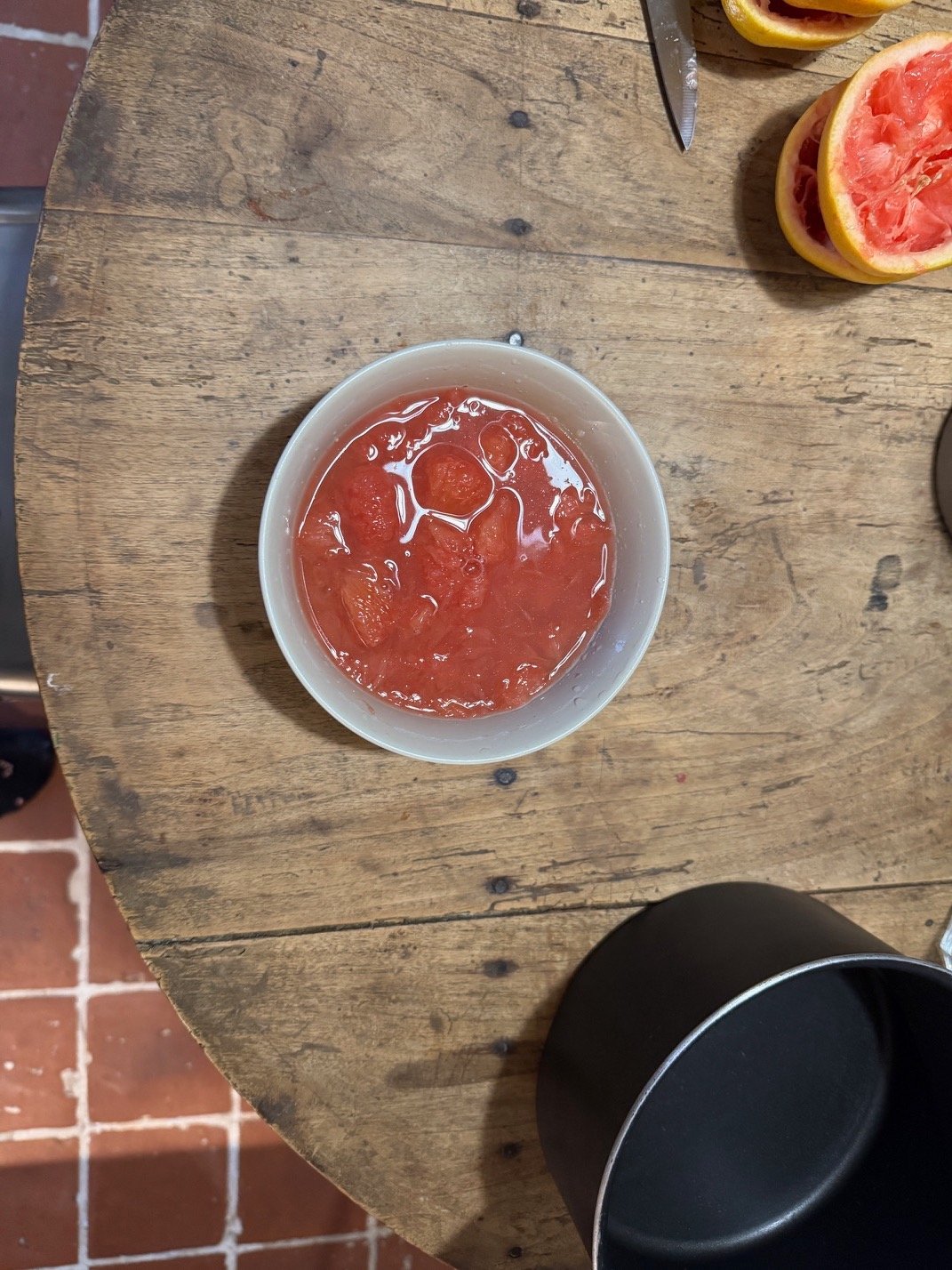 Prélever grossièrement les suprêmes (je le fais à la cuillère sur un pamplemousse coupé en deux, ça part en cuisson ensuite donc pas besoin de trop s'embêter). Il faut bien penser à gouter ses pamplemousses, et ne pas hésiter à rajouter 10 g de sucre s'ils sont très acides.