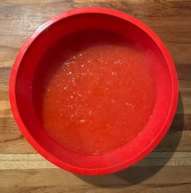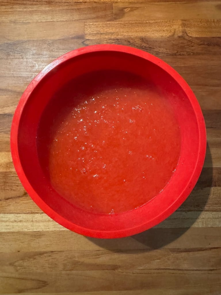 Faire chauffer dans une casserole. A ébullition, ajouter le mélange sucre et pectine et laisser cuire pendant 2 minutes en remuant sans cesse. Couler dans un moule de 18 cm de diamètre et réserver au congélateur pour au moins 5 heures.