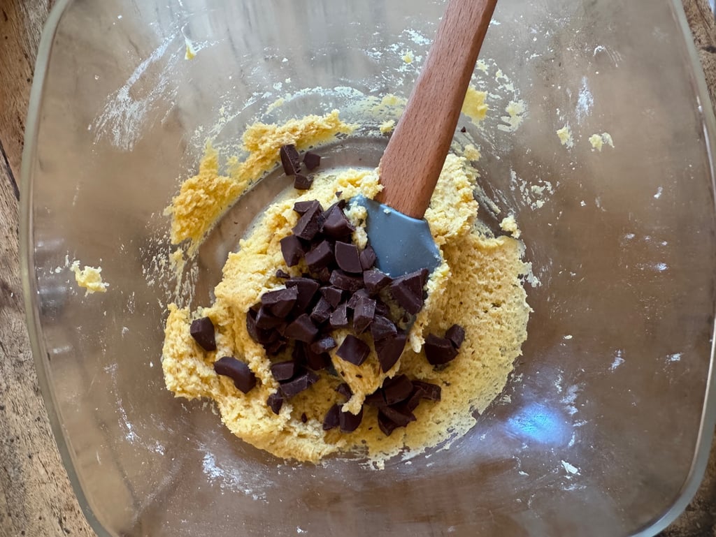 Mélanger le sucre et le beurre. Ajouter la farine, la levure et le bicarbonate, bien mélanger puis ajouter l'oeuf battu, puis les pépites de chocolat. Laisser reposer une heure au réfrigérateur.