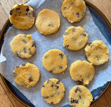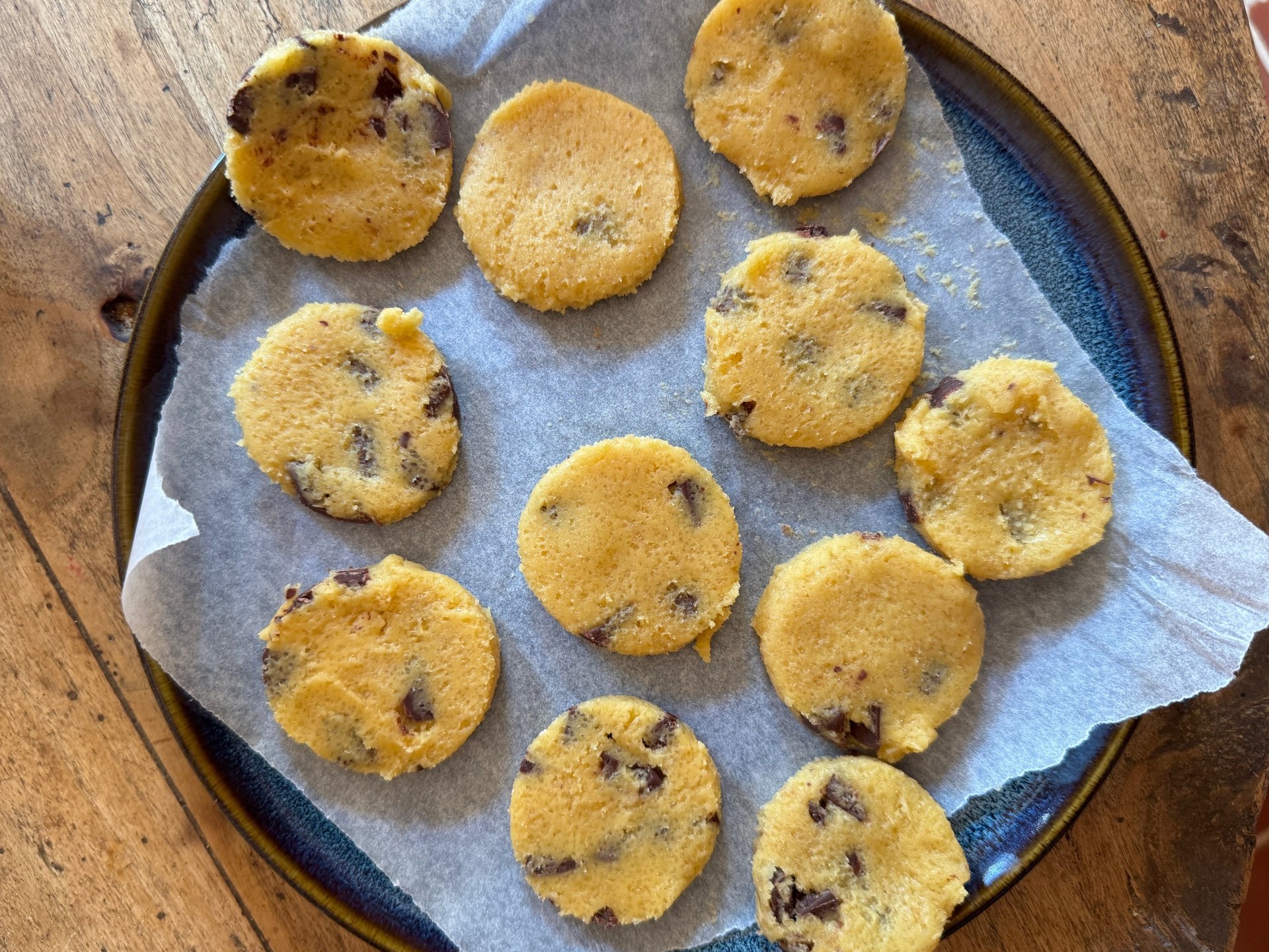 A la sortie du réfrigérateur, étaler entre deux feuilles de papier cuisson sur une épaisseur d'environ un centimètre, et découper des cookies à l'aide d'un emporte pièces de 5 centimètres de diamètre.