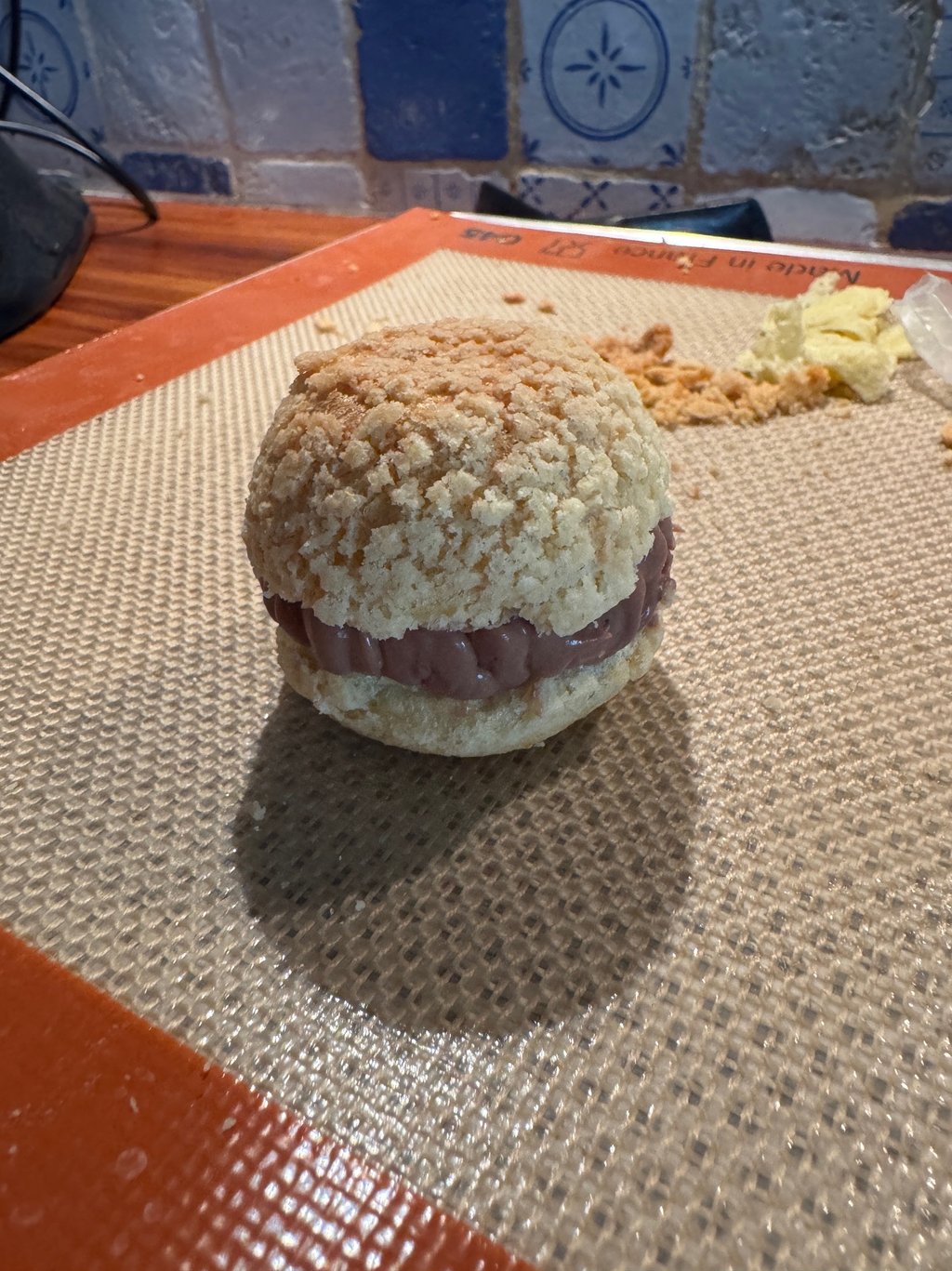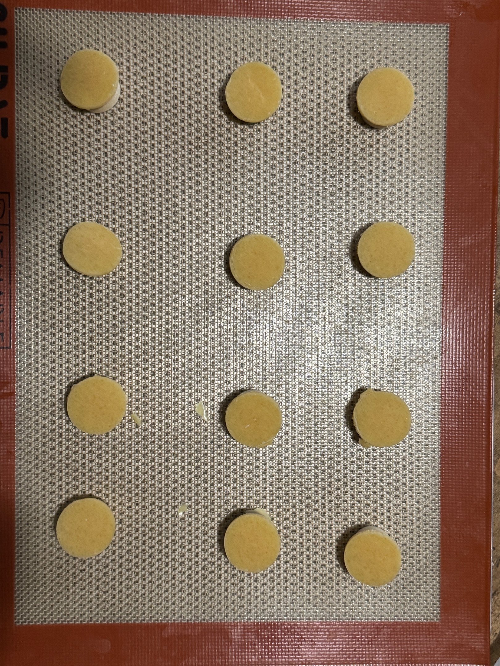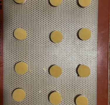 A l'aide d'emporte-pièces, détailler des disques dans le craquelin congelé de taille légèrement supérieure au diamètre de chaque chou (4 cm, 5cm et 8-9 cm).