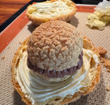 Dans les choux de moyenne taille : pocher un fond de crème pâtissière au chocolat dans le fond et le chapeau du chou, disposer un petit chou vanille entre les deux parties, et compléter l'espace entre le fond et le chapeau avec de la crème pâtissière au chocolat.