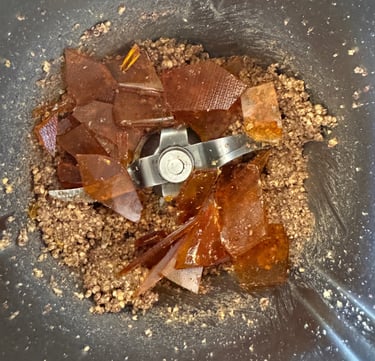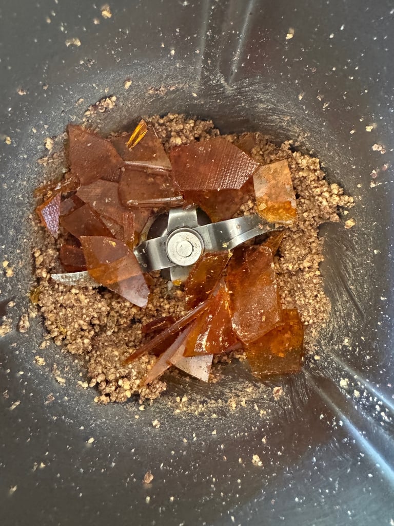Mixer les pécans et le caramel refroidis dans le bol du mixeur en raclant régulièrement les bords jusqu'à obtention d'un praliné bien onctueux (compter environ 3 à 5 minutes selon le mixeur).