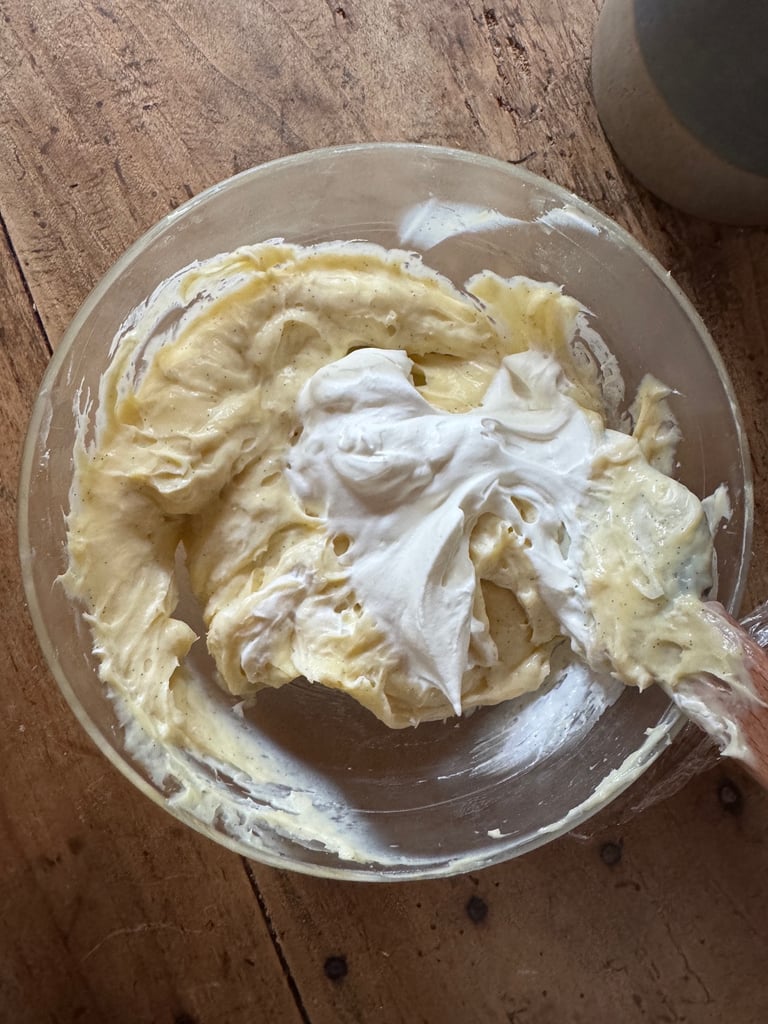 Quand le mélange est bien froid, monter la crème liquide en chantilly au batteur, et l'incorporer à la préparation. Réserver.