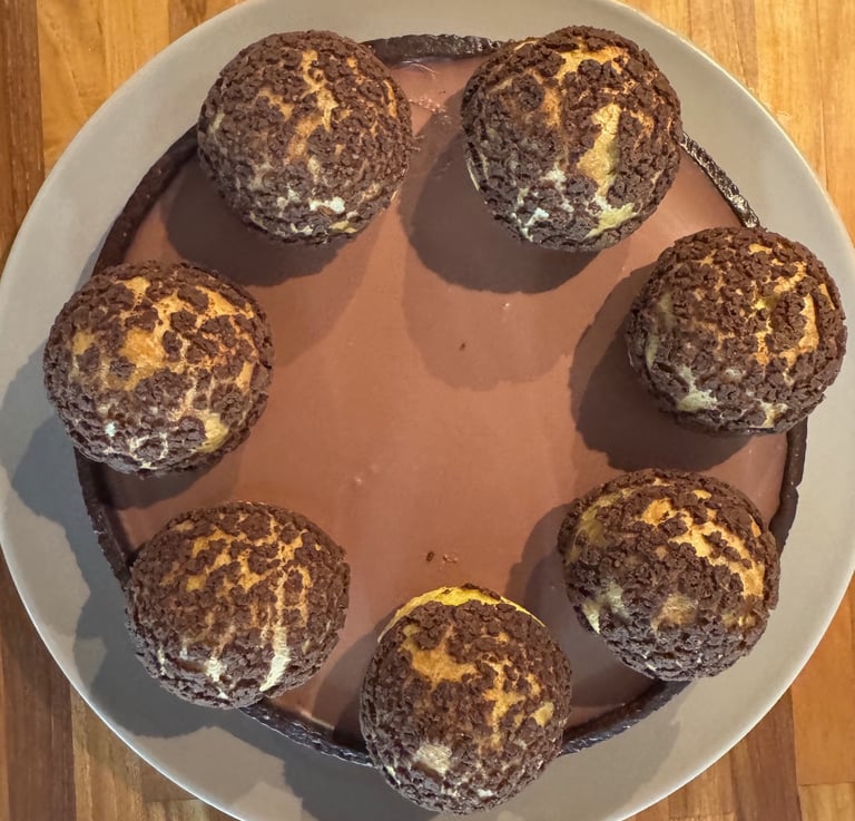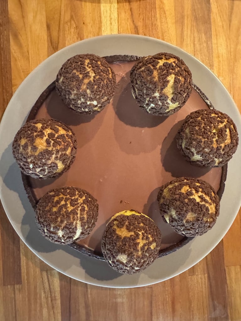 Disposer les choux sur le pourtour de la pâte à tarte, pocher la ganache de manière harmonieuse et disposer un dernier chou au centre de la tarte sur la ganache.
