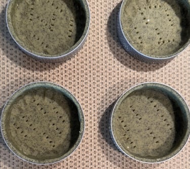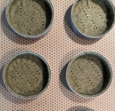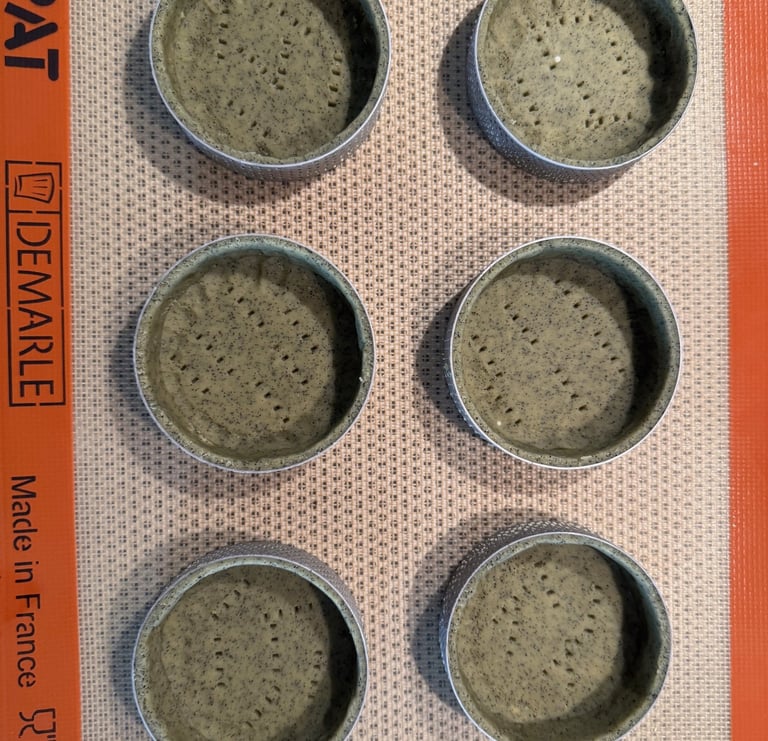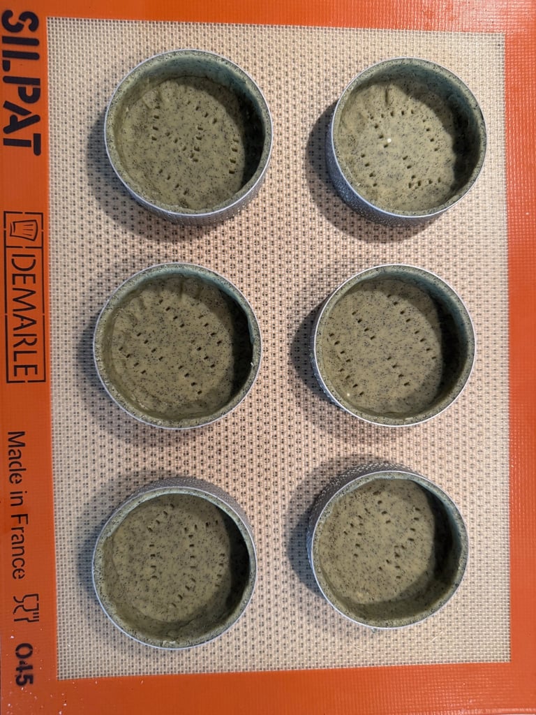 Etaler la pâte entre deux feuilles de papier cuisson sur une hauteur d'environ 2,5 mm. Beurrer l'intérieur des cercles à tartelettes. Foncer les cercles à tartelettes, puis réserver au congélateur pour deux heures minimum.