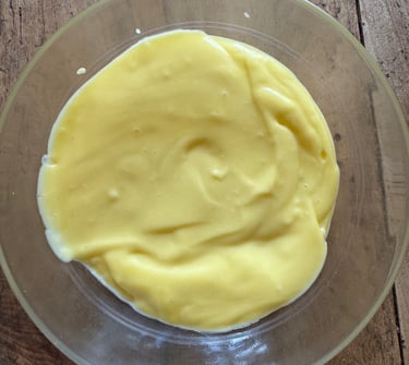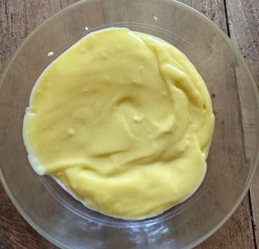 Ajouter la feuille de gélatine égouttée, bien mélanger. Laisser légèrement refroidir, puis ajouter le beurre mou coupé en morceaux. Mixer au mixeur plongeant pour uniformiser. Filmer au contact et réserver.