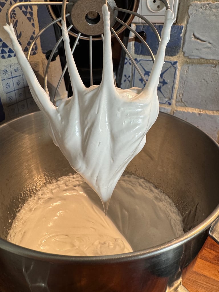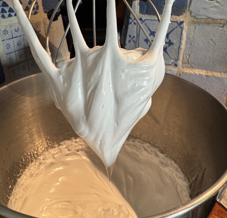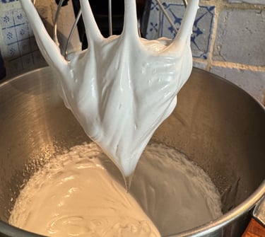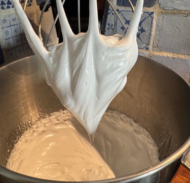 Pendant ce temps monter les blancs d'oeufs en neige. Quand les blancs sont souples, verser en filet le sirop de sucre en continuant de mélanger. Continuer de battre jusqu'à complet refroidissement. Vous devez normalement obtenir une meringue qui fait un beau bec d'oiseau.