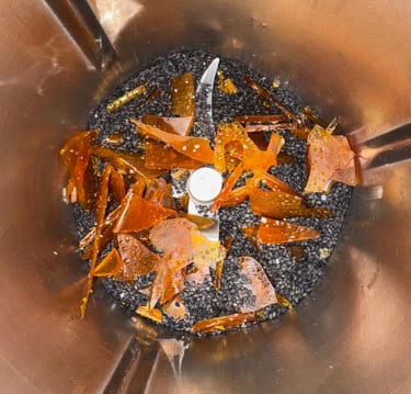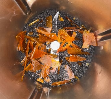 Verser les graines de sésame refroidies, le caramel froid coupé en morceaux, et la pincée de fleur de sel dans le bol du mixeur et mixer en raclant régulièrement les bords jusqu'à obtention d'un praliné bien onctueux (compter 5 à 10 minutes selon le mixeur).