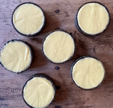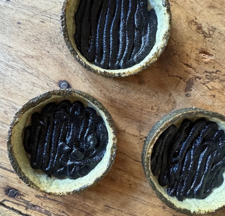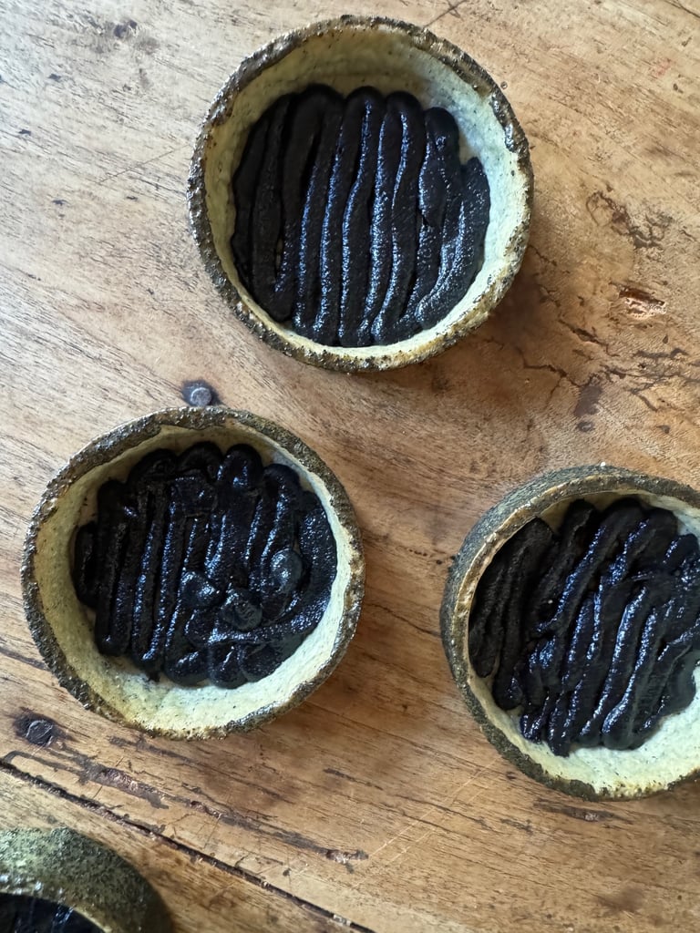 Sortir du four, laisser refroidir légèrement, décercler. Mélanger un jaune d'oeuf avec 5 g de crème fraîche et un peu de charbon végétal et badigeonner au pinceau le tour des tartelettes avec ce mélange.