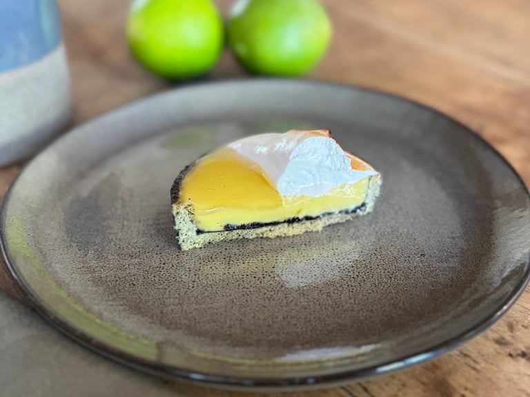 Voici une tarte pleine de surprise ! Un citron vert hyper punchy (parce qu'une bonne tarte au citron, c'est une tarte dont l'acidité est bien marquée) que viennent adoucir une délicate meringue italienne et un fond de praliné au sésame noir.