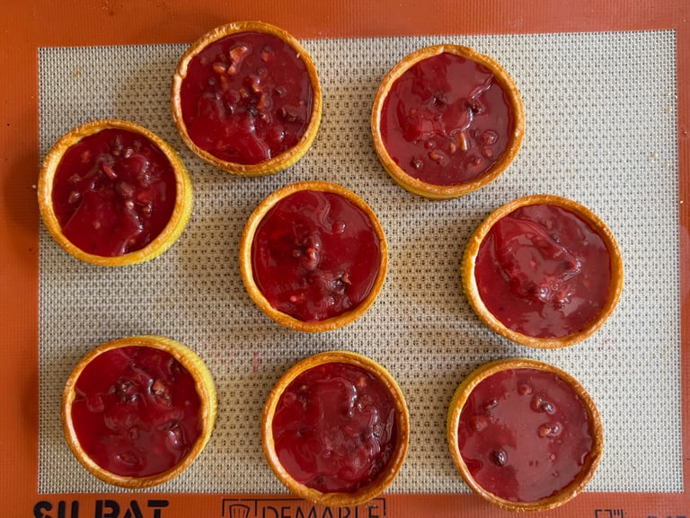 Dans chaque fond de tarte, verser une couche de confit de framboises, puis une couche de crémeux aux pralines roses.