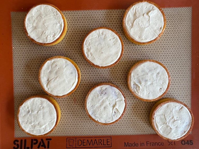 Etaler la pâte entre deux feuille de papier cuisson sur une hauteur d'environ 2,5 mm. Foncer les moules de tartelettes, puis réserver au congélateur pour deux heures minimum.