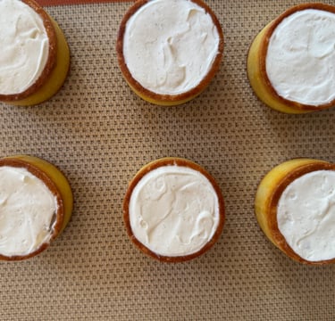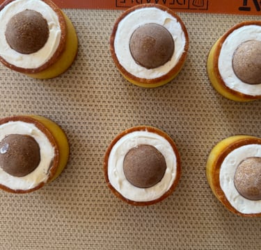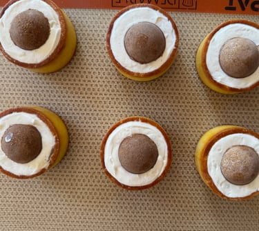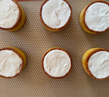 Procéder au montage de la ganache à la vanille. Mettre la ganache dans le bol du robot et fouetter jusqu'à une consistance souple formant un bec d'oiseau qui tient bien. Mettre la ganache dans une poche à douille munie d'un d'une douille ronde de 4 cm de diamètre (j'utilise un cercle à cookie comme douille).