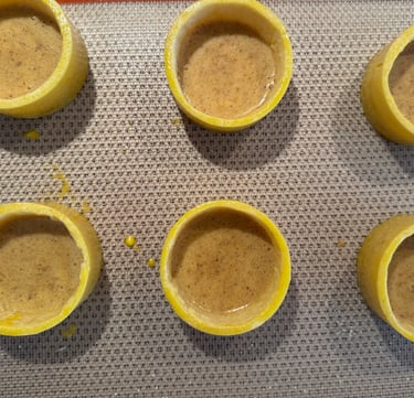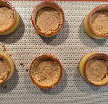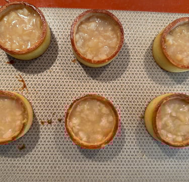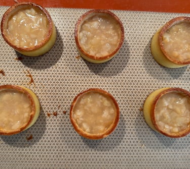 Sortir du four, laisser refroidir légèrement, décercler. Mélanger un jaune d'oeuf avec 5 g de crème fraîche et badigeonner au pinceau le tour des tartelettes avec ce mélange. Verser un fond de pécantine sur environ un centimètre d'épaisseur dans chaque moule.